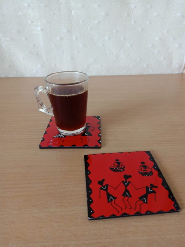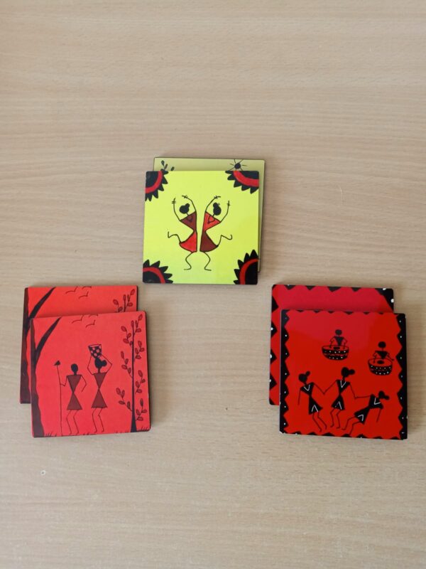 Fibre Coasters, crafted from durable fibre art sheets featuring intricate designs including Warli and Mandala art.
