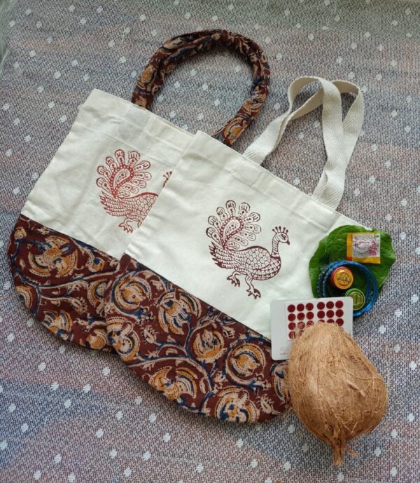 Eco-friendly cotton bag with Kalamkari and hand-block prints, blending sustainable style with traditional charm