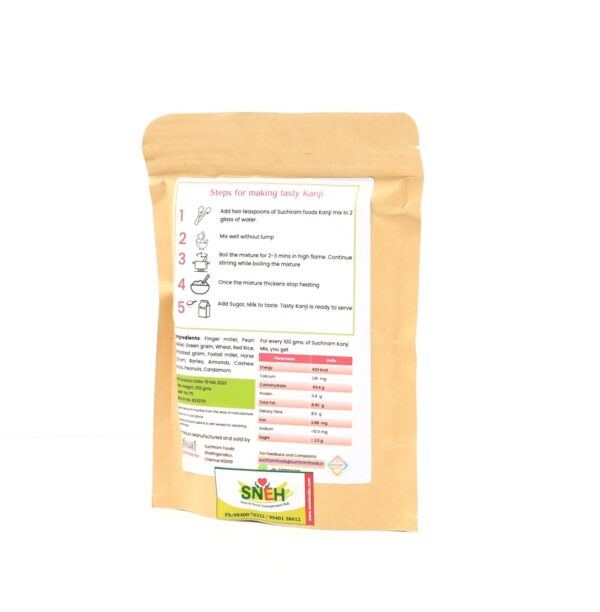 A blend of finger millet, pearl millet, green gram, wheat, red rice, roasted gram, foxtail millet, horse gram, barley, almond, cahew nuts, peanut & cardamom powdered together for a healthy kanji drink.