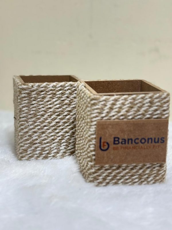 Sturdy wooden multipurpose holder made with hand braided jute work.